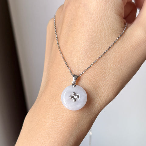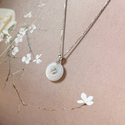 Jadeite donut center with our signature lilac flower motifs. They symbolise happiness and tranquility.