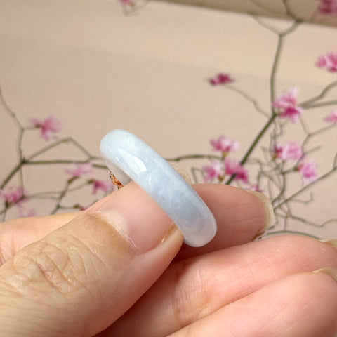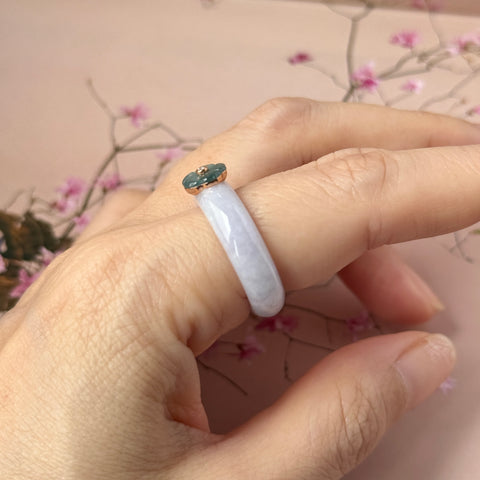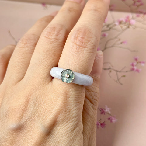 Pretty lavender jadeite abacus ring bands, topping it off with an intricately carved Cherry Blossom flowers (Bluish green jadeite material is used for the Cherry Blossom flowers), center with a single diamond, mounted with 18k rose gold. A dainty ring piece that would go well with your daily style but yet giving it a splash of uniqueness to be a statement piece.