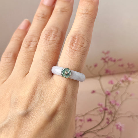 Pretty lavender jadeite abacus ring bands, topping it off with an intricately carved Cherry Blossom flowers (Bluish green jadeite material is used for the Cherry Blossom flowers), center with a single diamond, mounted with 18k rose gold. A dainty ring piece that would go well with your daily style but yet giving it a splash of uniqueness to be a statement piece.