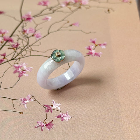 Pretty lavender jadeite abacus ring bands, topping it off with an intricately carved Cherry Blossom flowers (Bluish green jadeite material is used for the Cherry Blossom flowers), center with a single diamond, mounted with 18k rose gold. A dainty ring piece that would go well with your daily style but yet giving it a splash of uniqueness to be a statement piece.