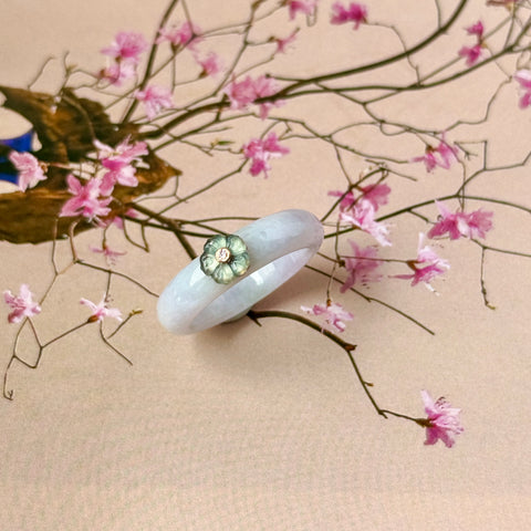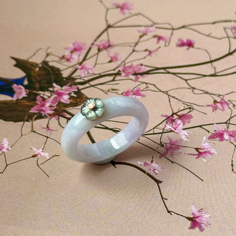 Pretty lavender jadeite abacus ring bands, topping it off with an intricately carved Cherry Blossom flowers (Bluish green jadeite material is used for the Cherry Blossom flowers), center with a single diamond, mounted with 18k rose gold. A dainty ring piece that would go well with your daily style but yet giving it a splash of uniqueness to be a statement piece.