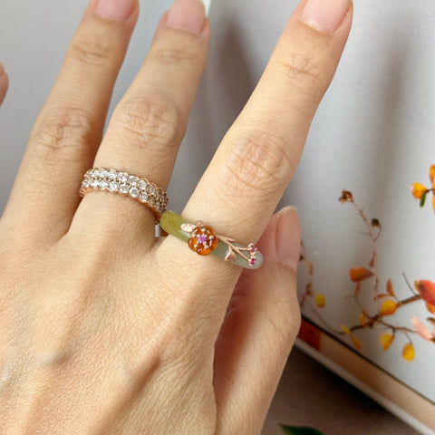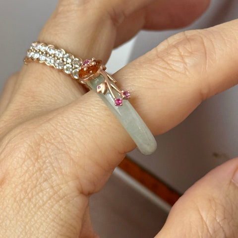 Our signature Joseon Dynasty Sakura Ring Band in red on bluish green floral and yellow. The style of this ring has been elevated with more details. Sakura flower with branches, jadeite mount in 18k rose gold with pink sapphires. New style of colours in our collection.