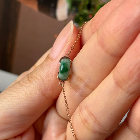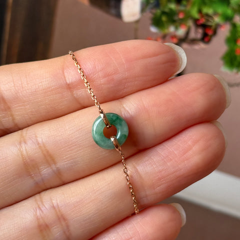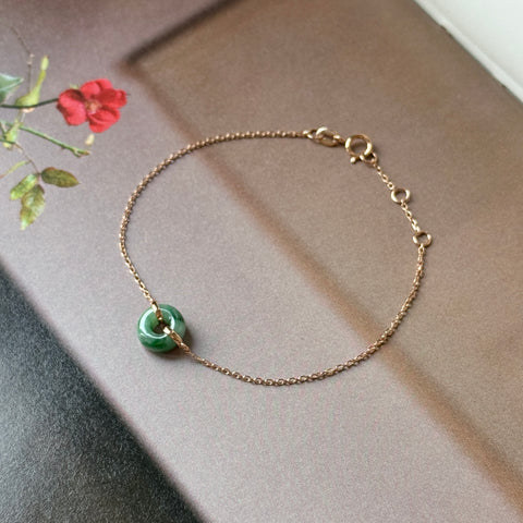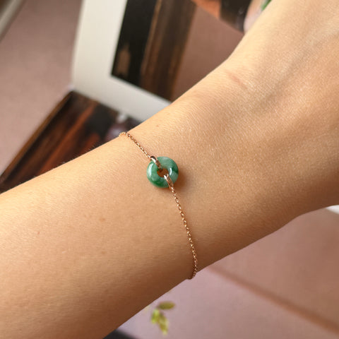 Jadeite mount in 18k rose gold closed with a spring back hook and jump ring as a bespoke bracelet.